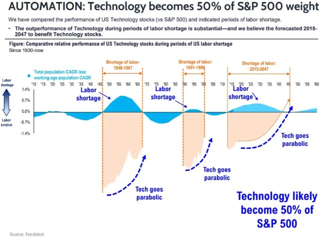 随着越来越多的公司在技术上投入数万亿美元,以解决全球劳动力短缺问题,这将推动科技板块在标普500指数中的占比达到50%,信息技术板块目前占该指数的30%左右。