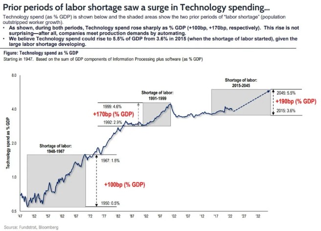 Lee表示,随着全球劳动力短缺问题日益严重,未来几年科技支出将大幅增长。Lee解释道:“由于全球劳动力短缺,人工智能正在为全球提供数字劳动力,这对美国科技公司来说是一个巨大的机会。所以我认为,这两股力量结合在一起,推动了近十年来股市的高回报。我认为将会有很多美元花在美国的科技产品上,因为到这个十年结束时,世界将缺少8000万工人,这意味着大约3万亿美元的劳动力工资将转向芯片,所以这意味着美国芯片和人工智能供应商将有3万亿美元的收入。”