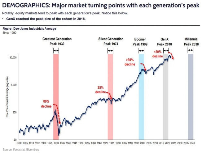 从历史上看,在人口达到50岁左右的年龄巅峰期时,股市也会见顶,因为他们接近退休年龄,通常会减少支出。例如,当“最伟大的一代”在1930年达到巅峰年龄时,恰逢股市持续多年的熊市。时间快进到1974年,“沉默的一代”迎来了他们的黄金时代。与此同时,股市也经历了持续数年的约35%的痛苦回调。婴儿潮一代的黄金年龄在1999年达到巅峰,就在一年后,股市陷入了长达数年的熊市。